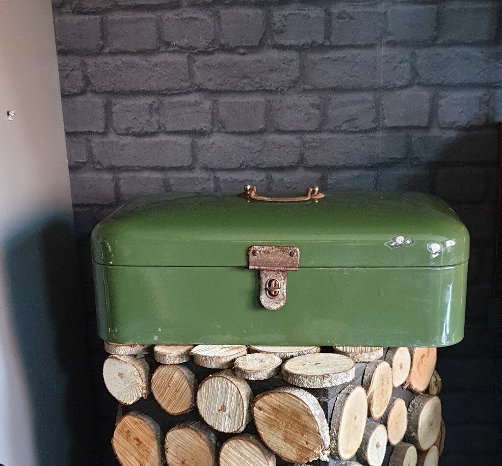 Oei deze stond buiten, dan wel onder een afdak, maar toch! Maar wat zag hij er dan nog goed uit!, oke flink onder handen genomen maar dat is hij toch waard? Er zijn wat roestige elementen maar dat is helemaal niet erg. Het is een prachtige brocante diep groene broodtrommel die zeker in uw interieur past!