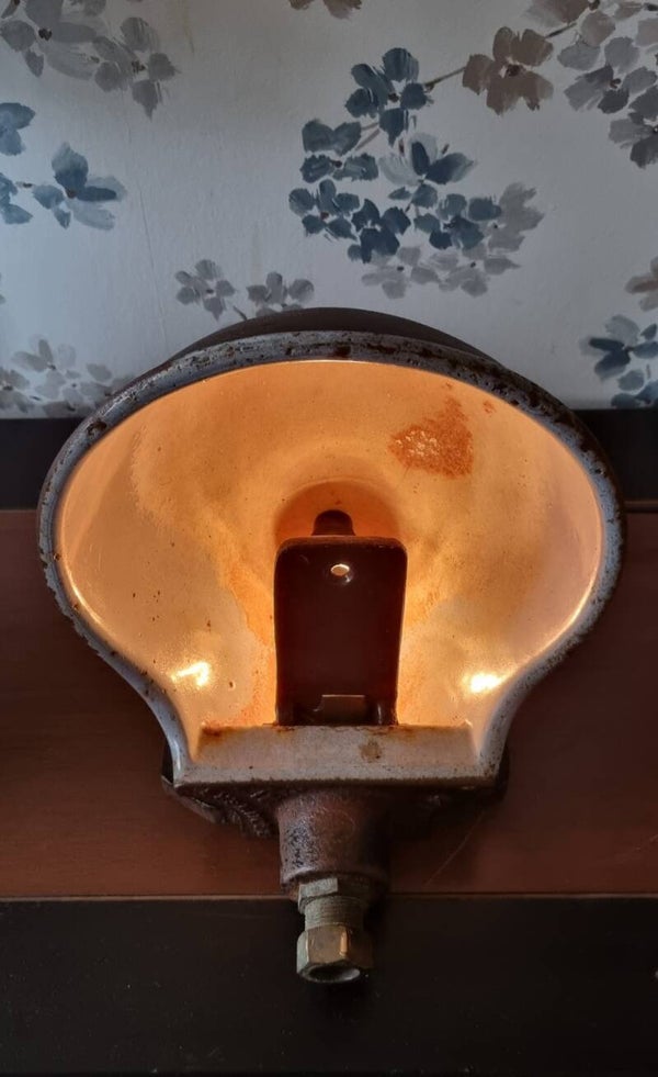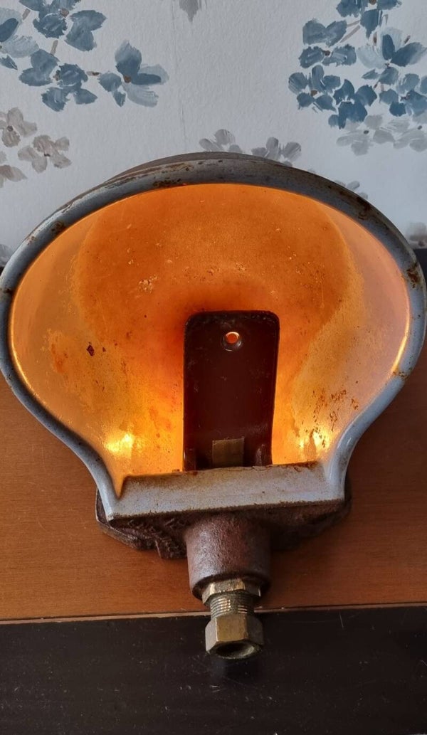 Wauw wat een sfeer geeft deze oude vee drinkersbak lamp . Wat een unieke lamp.34 cm breed, 30 cm hoog en wegen 7 kilo